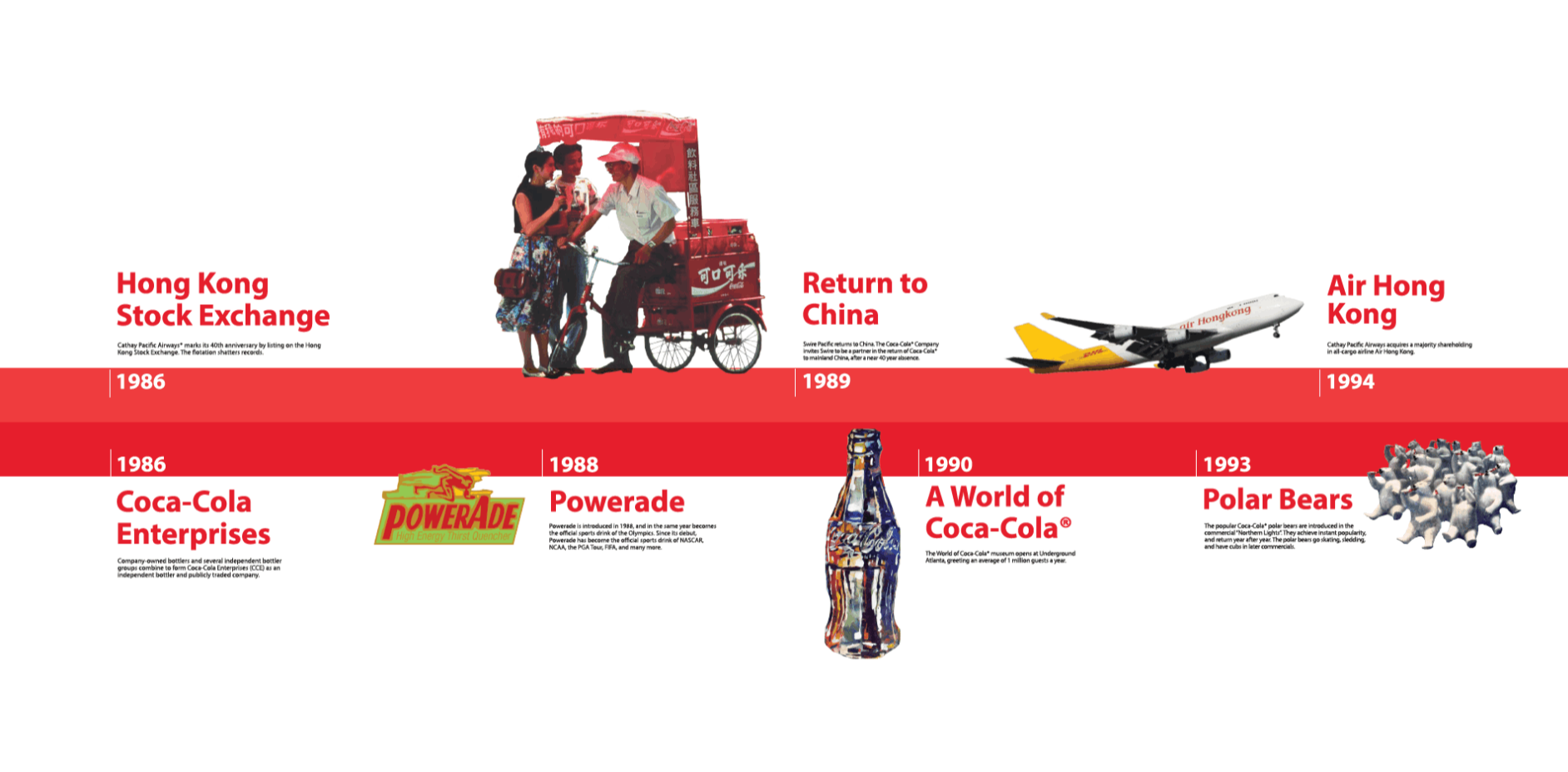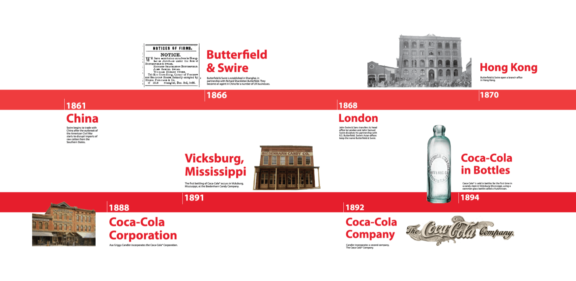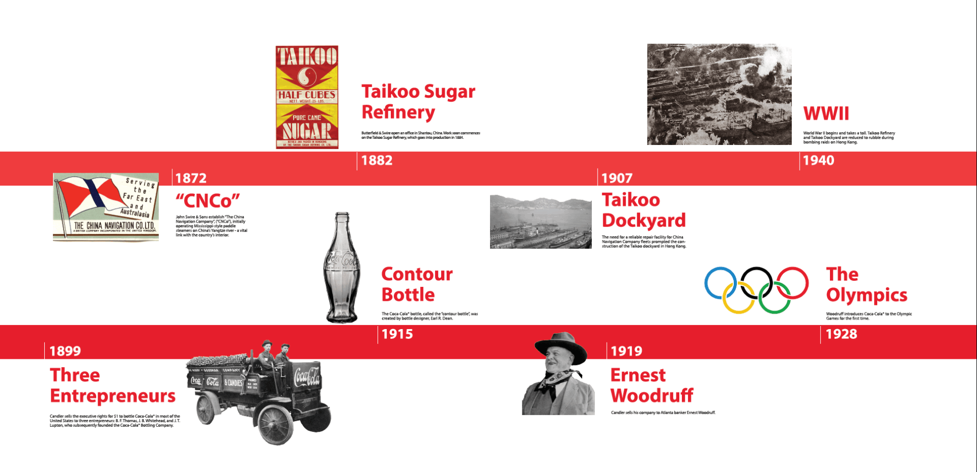 Swire Coca-Cola,USA is a bottler for Coca-Cola in the United States, with a territory covering 11 states. Their parent companies, Swire Pacific and Coca-Cola, both have rich histories. The task was to take two visually different timelines and combine them to create a cohesive story to display in their facilities.
