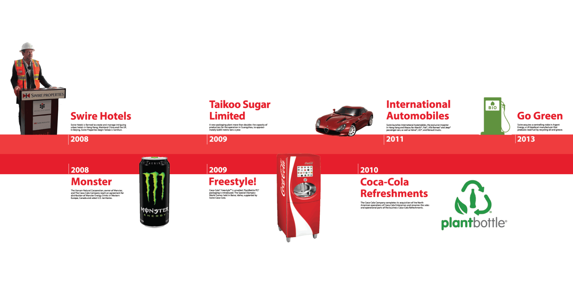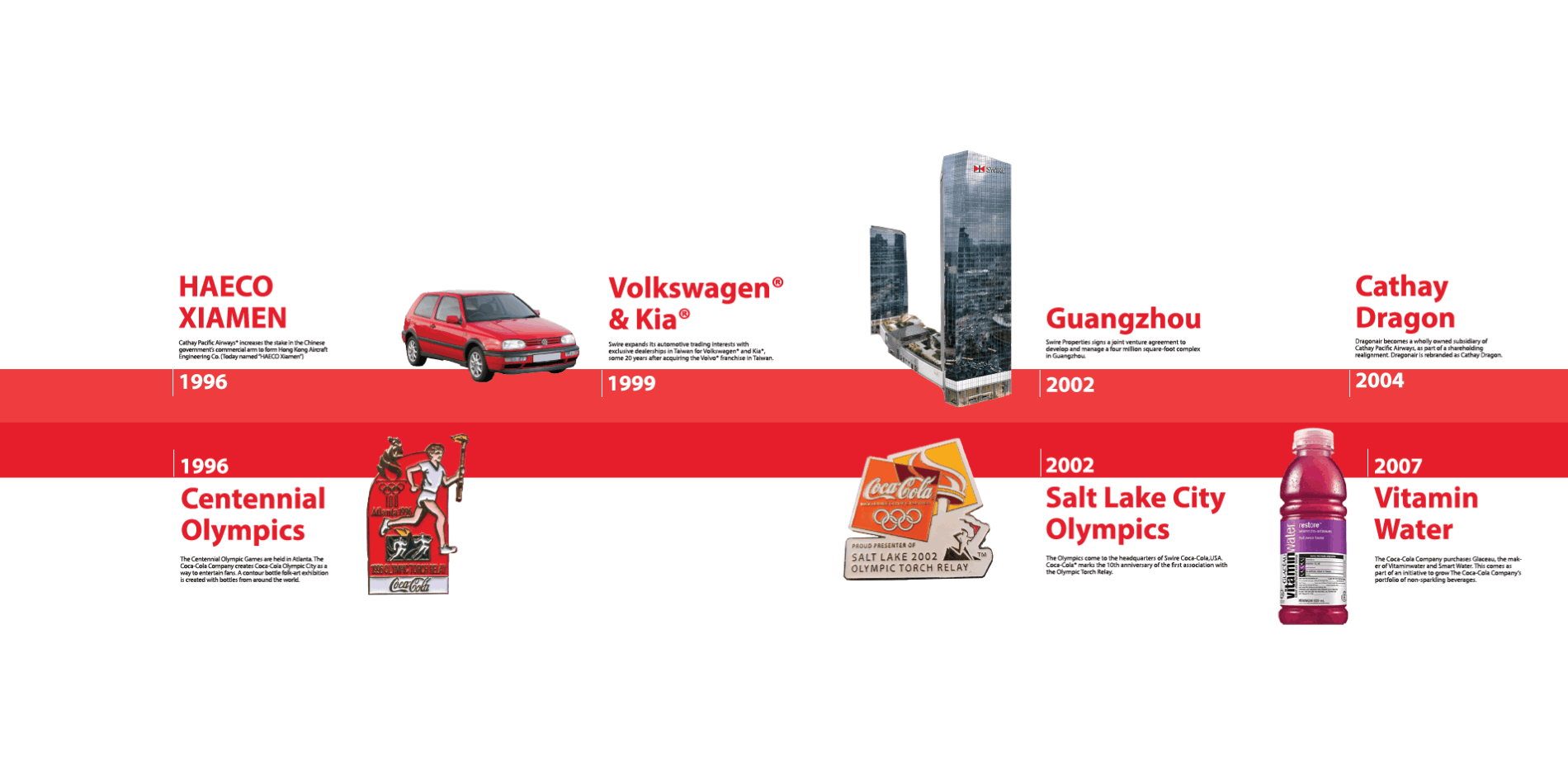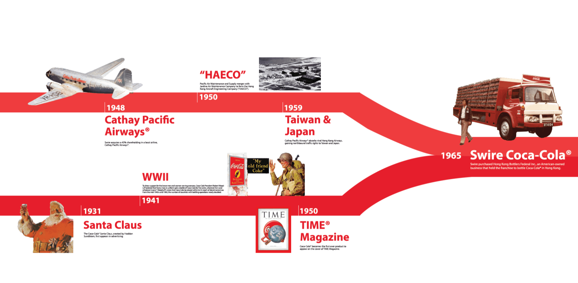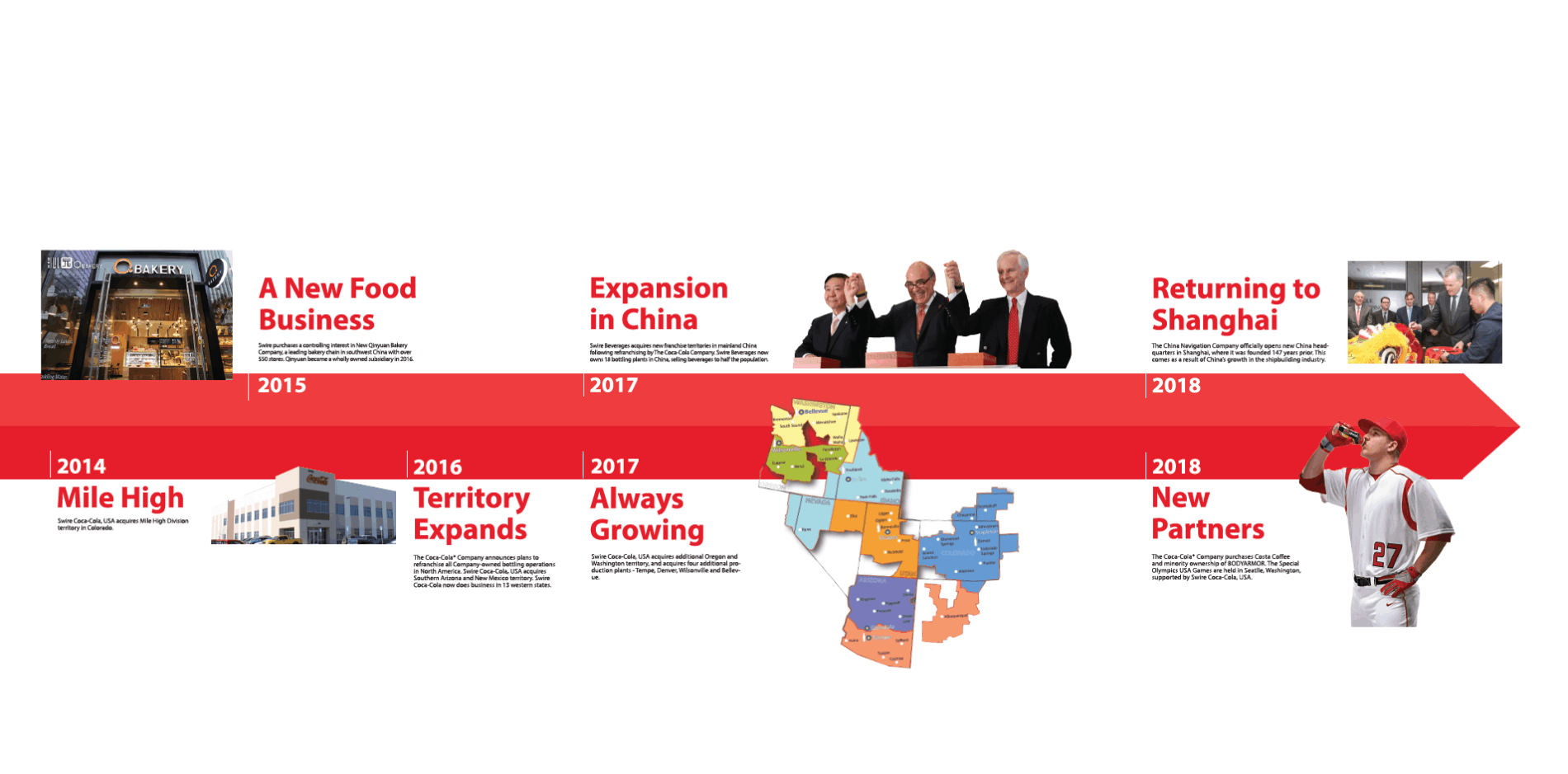Swire Coca-Cola,USA is a bottler for Coca-Cola in the United States, with a territory covering 11 states. Their parent companies, Swire Pacific and Coca-Cola, both have rich histories. The task was to take two visually different timelines and combine them to create a cohesive story to display in their facilities.